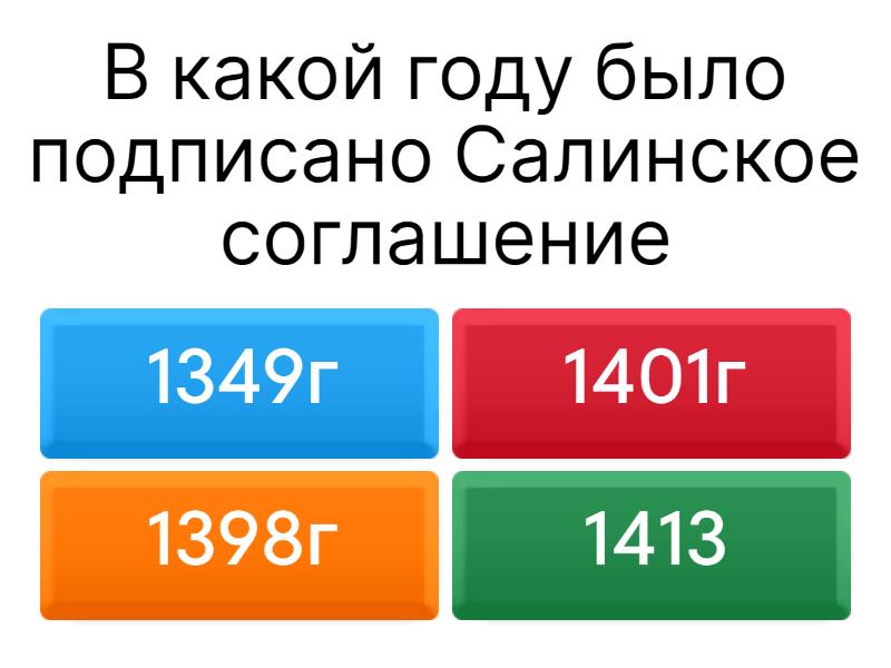 1) В какой году было подписано Салинское соглашение a) 1349г b) 1401г c) 1398г d) 1413 2) как называлась уния которая была подписана в 1401 году a) Городельская уния b) Виленско-Радомская уния  c) Кревская уния 3) Какая точная дата Грюнвольдской битвы a) 15 июля 1430г b) 19 июля 1450г c) 8 июля 1430г d) 12 июля 1340 4) В каком году умер Витовт a) 3 октября 1430г b) 4 октября 1460г c) 9 ноября 1760г d) 27 октября 1430г 5) Уже в декабре какого года состоялась совещание Витовта и Ягайло в Новгороде.Там было принято решение о начале войны с Тевтонским орденом a) 1408г b) 1456г c) 1990г d) 1399г 6) Да или нет :В 1411году в городе Торунь был заключён мир.Наиболее выгодным он был для ВКЛ a) Да b) Нет 7) Выберите год коронации князя Миндовга a) 1259г b) 1252г c) 1253г d) 1278г 8) Выберите год заключения Островского соглашения a) 1398г b) 1392г c) 1344г d) 1387г 9) Как называлась эта уния которая была подписана в 1413 a) Кревская b) Киевскся c) Виленско-Радомская уния d) Городельская 10) Как называлась эта уния которая была подписана 14 августа 1385 года a) Кревская b) Городельская c) Виленско-Радомская