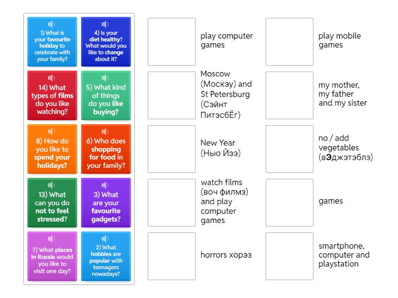 1) What is your favourite holiday to celebrate with your family? - New Year (Нью Йээ), 2) What hobbies are popular with teenagers nowadays? - play computer games, 3) What are your favourite gadgets? - smartphone, computer and playstation, 4) Is your diet healthy? What would you like to change about it? - no / add vegetables (вЭджэтэблз), 5) What kind of things do you like buying? - games, 6) Who does shopping for food in your family? - my mother, my father and my sister, 7) What places in Russia would you like to visit one day? - Moscow (Москэу) and St Petersburg (Сэйнт ПитэсбЁг), 8) How do you like to spend your holidays? - watch films (воч филмз) and play computer games, 13) What can you do not to feel stressed? - play mobile games, 14) What types of films do you like watching? - horrors хорэз,