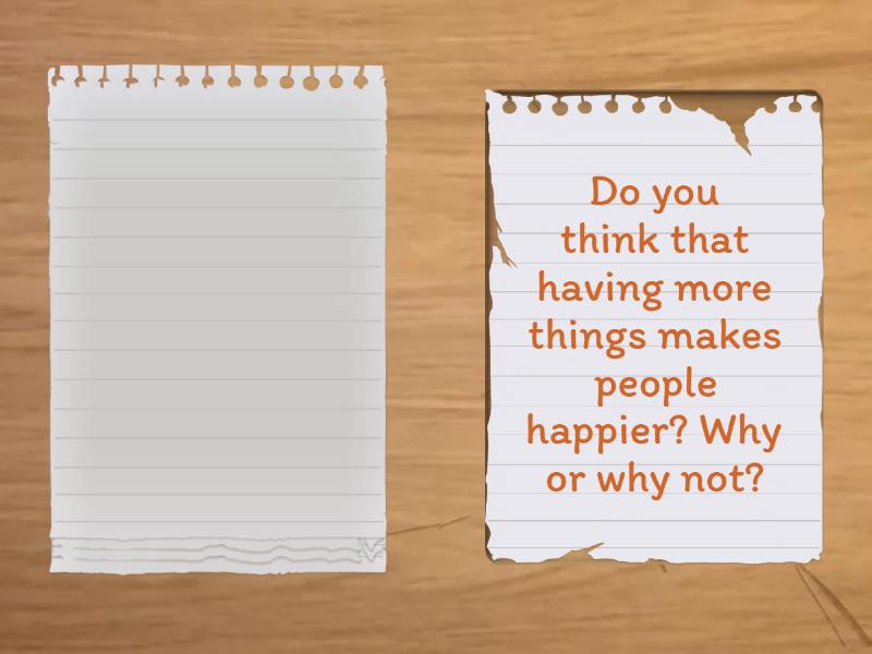 Do you think that having more things makes people happier? Why or why not?, What’s something you bought recently that you really didn’t need?, How much stuff do you think you own compared to your parents or grandparents?, If you had to move to a much smaller home, what would you keep? What would you get rid of?, Do you think modern society encourages people to buy too much?.