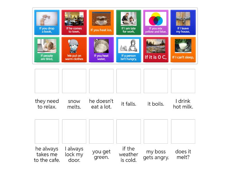 If you heat water, - it boils., If you drop a book, - it falls., If it is 0 C, - snow melts., We put on warm clothes - if the weather is cold., If a person isn't hungry, - he doesn't eat a lot., If people are tired, - they need to relax., If I am late for work, - my boss gets angry., If you heat ice, - does it melt?, If I can't sleep, - I drink hot milk., If he comes to town, - he always takes me to the cafe., If I leave my house, - I always lock my door., If you mix yellow and blue, - you get green.,