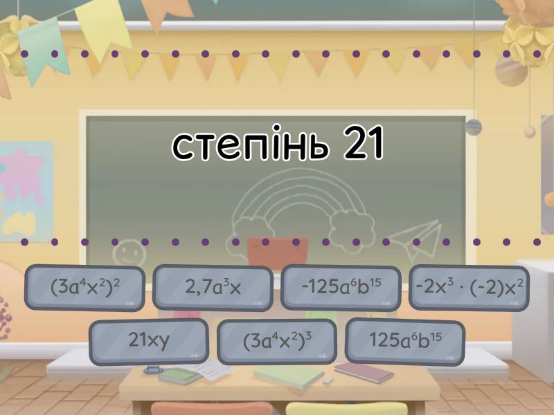 -125а6b15  - степінь 21, 125а6b15 - коефіцієнт 125, 2,7а3х - степінь 4, 21ху - коефіцієнт 21, -2х3  · (-2)х2 - коефіцієнт 4, (3а4х2)3 - коефіцієнт 27, (3а4х2)2 - степінь 12,