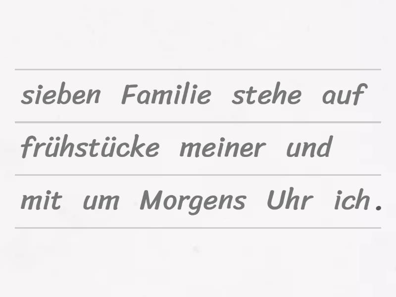Morgens stehe ich um sieben Uhr auf und frühstücke mit meiner Familie., Vormittags lerne ich Deutsch und schreibe neue Wörter in mein Heft., Mittags esse ich mit meinen Kollegen in der Kantine., Nachmittags gehe ich einkaufen oder mache Hausaufgaben., Abends sehe ich eine Serie und telefoniere mit meiner Mutter., Nachts ist es ruhig, und ich schlafe gut., Der Kurs beginnt um acht Uhr, also komme ich pünktlich., Zuerst wasche ich mein Gesicht, dann putze ich die Zähne., Danach ziehe ich mich an und gehe zur Arbeit., Schließlich esse ich Abendbrot und gehe ins Bett., Später lese ich ein Buch oder höre Musik., Jede Woche haben wir einen Test im Deutschkurs., Jeden Tag lerne ich zehn neue Wörter., Am Wochenende besuche ich meine Großeltern., Ich trinke immer Wasser zum Mittagessen., Manchmal gehe ich ins Kino mit Freunden., Selten esse ich Fleisch, weil ich Vegetarier bin., Ich bin nie spät zur Schule gekommen., Alle Studenten machen bei der Übung mit., Niemand ist heute krank., Etwas liegt unter dem Tisch., Nichts ist im Kühlschrank – ich muss einkaufen gehen!,