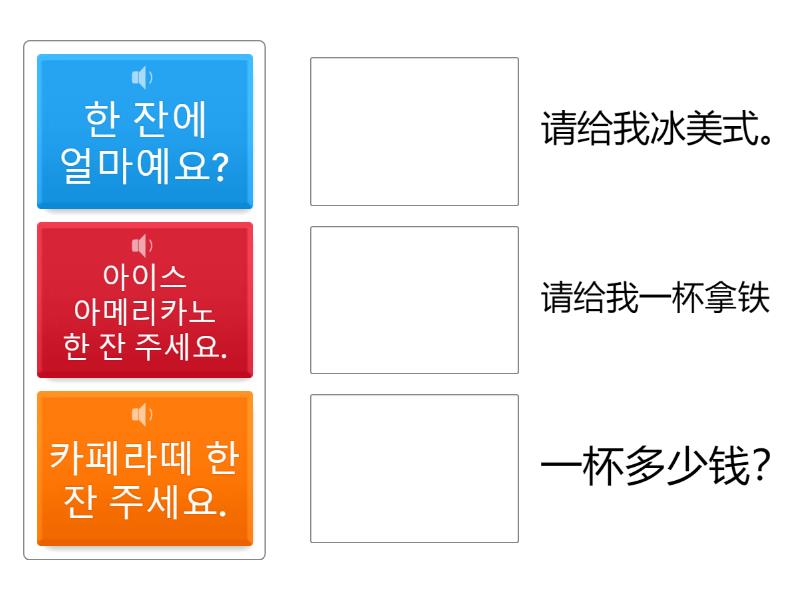 아이스 아메리카노 한 잔 주세요. - 请给我冰美式。, 한 잔에 얼마예요? - 一杯多少钱?, 카페라떼 한 잔 주세요. - 请给我一杯拿铁,