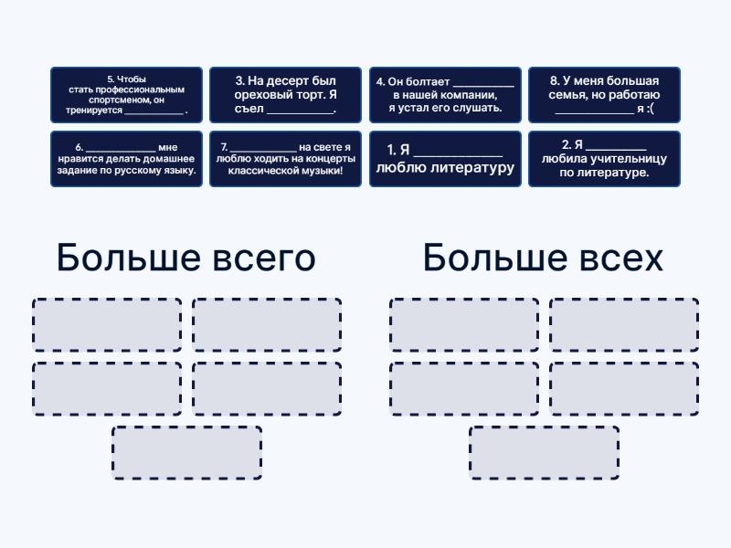 Больше всего: 1. Я ____________ люблю литературу, 6. ______________ мне нравится делать домашнее задание по русскому языку., 7. _____________ на свете я люблю ходить на концерты классической музыки!, Больше всех: 2. Я __________ любила учительницу по литературе., 3. На десерт был ореховый торт. Я съел ___________., 4. Он болтает ___________ в нашей компании, я устал его слушать., 5. Чтобы стать профессиональным спортсменом, он тренируется _____________ ., 8. У меня большая семья, но работаю _____________ я :(,