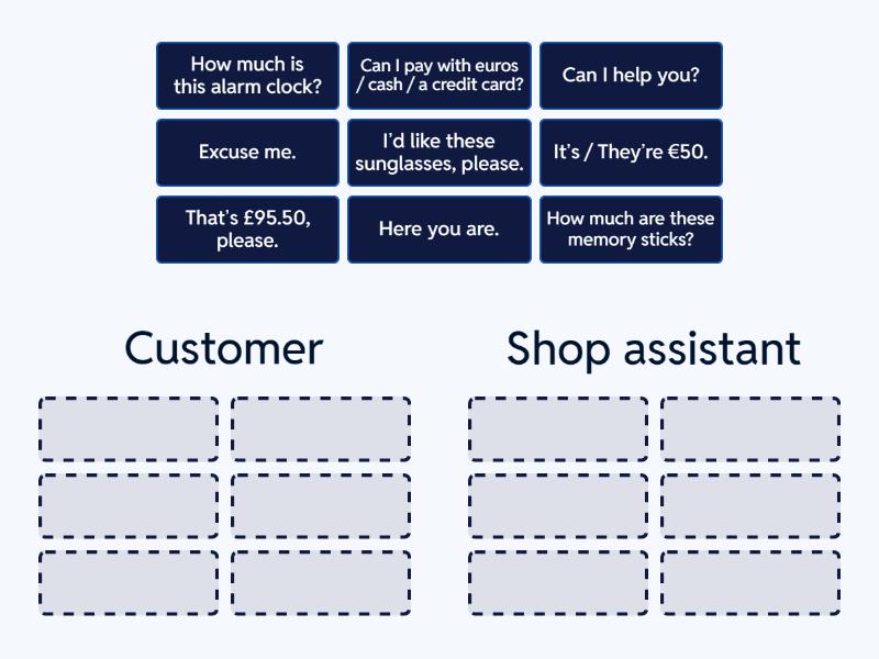 Customer: Excuse me., I’d like these sunglasses, please., How much is this alarm clock?, How much are these memory sticks?, Can I pay with euros / cash / a credit card?, Here you are., Shop assistant: Can I help you?, It’s / They’re €50., That’s £95.50, please.,