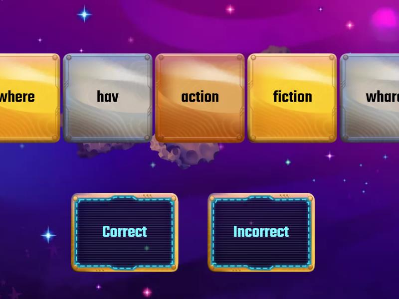 Correct: action, fiction, then, have, grass, when, what, where, why, who, Incorrect: acsion, ficton, thenn, hav, gras, hoo, wye, whare, wat, wen,