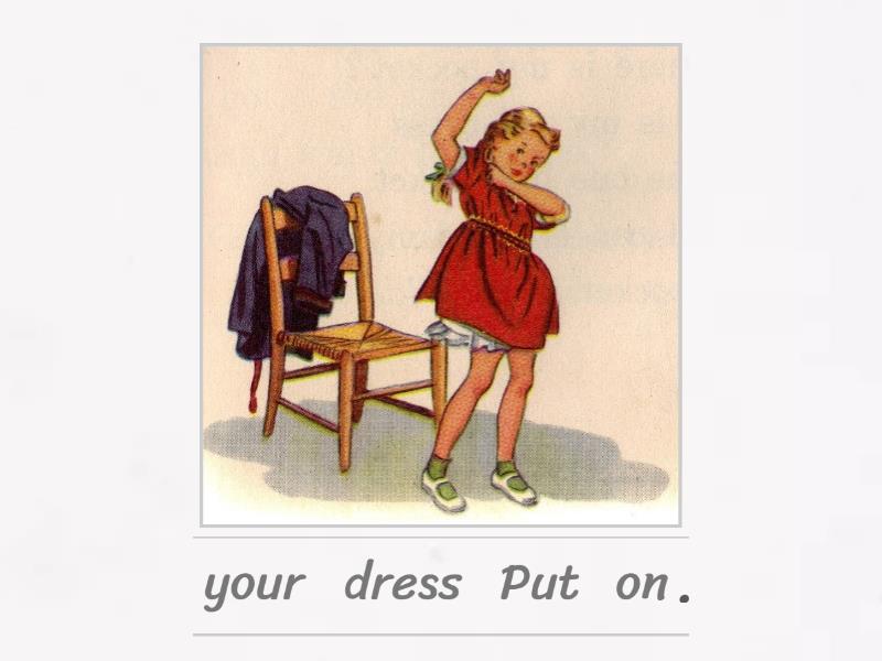 Put on your dress., Put on your jacket., Put on your shoes. , Put on your hat., Put on your T-shirt. , Put on your socks.,