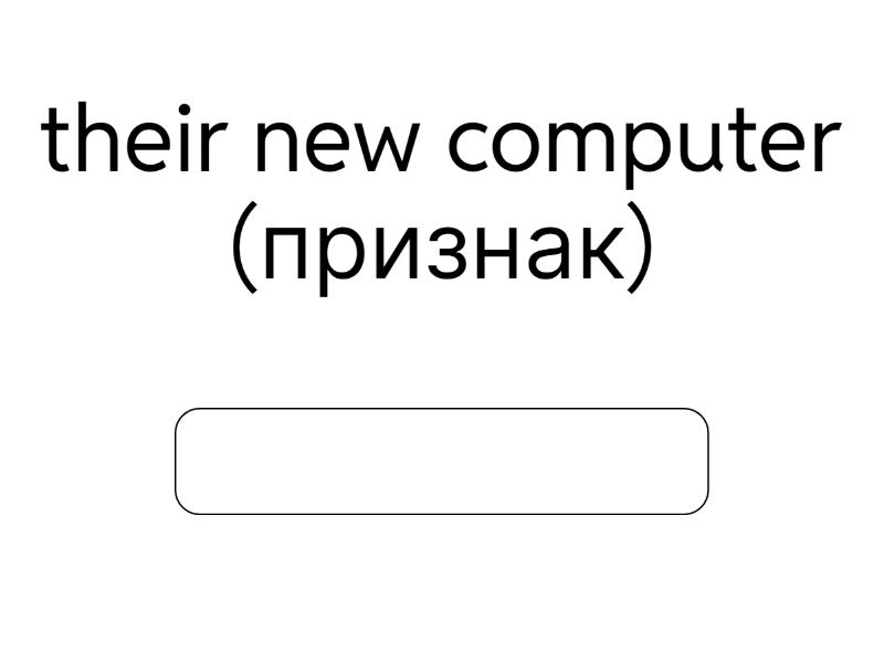 your black dogs (признак), my new pen (конкретный предмет), his white chairs (конкретный предмет), her yellow desk (признак), its big tables (конкретный предмет), our red apple (признак), their green marker (конкретный предмет), my blue pencil cases (признак), its big cats (конкретный предмет), their new computer (признак).