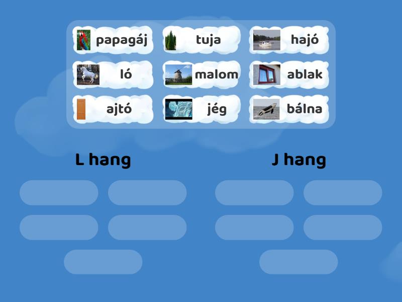 L hang: ló, ablak, malom, bálna, J hang: jég, ajtó, tuja, papagáj, hajó,