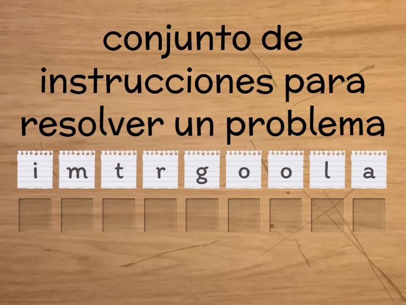 algoritmo - conjunto de instrucciones para resolver un problema, eficiencia - Es la mejora de la producción de un algoritmo, logica - es el razonamiento paso a paso de un algorimo, problema - razón por la que se crea el algoritmo, instrucciones - paso a paso dado para la resolución de un problema ,