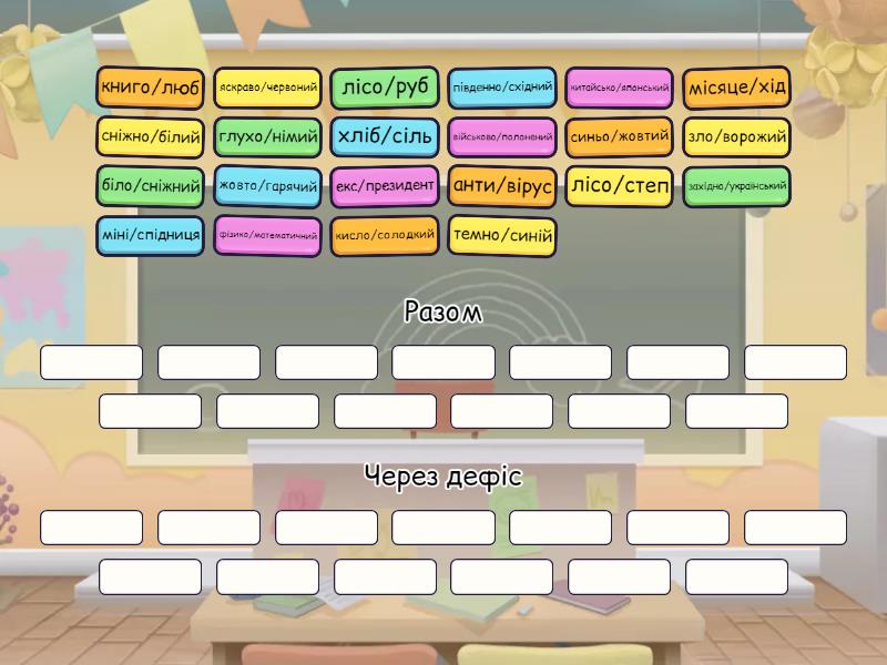 Разом: лісо/степ, книго/люб, місяце/хід, лісо/руб, екс/президент, міні/спідниця, анти/вірус, біло/сніжний, військово/полонений, глухо/німий, зло/ворожий, жовто/гарячий, західно/український, Через дефіс: яскраво/червоний, темно/синій, сніжно/білий, синьо/жовтий, китайсько/японський, південно/східний, кисло/солодкий, хліб/сіль, фізико/математичний,