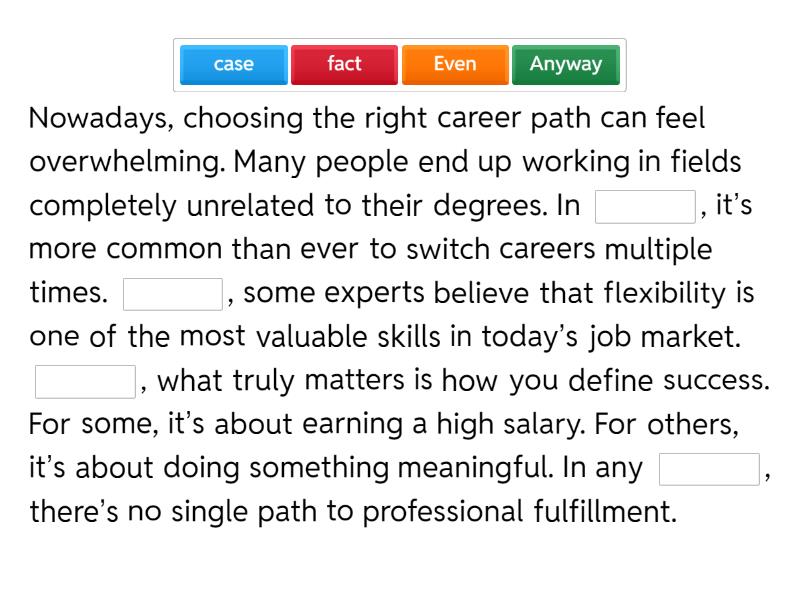 Nowadays, choosing the right career path can feel overwhelming. Many people end up working in fields completely unrelated to their degrees. In ____, it’s more common than ever to switch careers multiple times. ____, some experts believe that flexibility is one of the most valuable skills in today’s job market. ____, what truly matters is how you define success. For some, it’s about earning a high salary. For others, it’s about doing something meaningful. In any ____, there’s no single path to professional fulfillment. As I was ____, the idea of success varies from person to person. After ____, not everyone dreams of becoming a CEO. At least, not at the beginning of their journey. Let´s consider success as a combination of passion, perseverance, and opportunity. On the ____, people who follow their interests tend to feel more satisfied in the long run. What’s more, lifelong learning allows you to grow and change direction if needed. ____, hard work plays an important role in any career. ____ you work hard, you won´t reach your goals. If you stay curious and open to new experiences, you’ll find opportunities where you least expect them. In other ____, your mindset can shape your professional future. Many see success as not only reaching a goal but also enjoying the process. You need to adapt and reflect along the way. ____, you might end up chasing someone else’s definition of success.