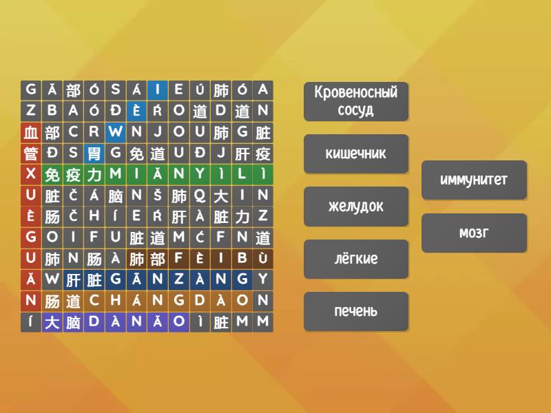 免疫力 miǎnyìlì - иммунитет, 大脑 dànǎo - мозг, 血管 xuèguǎn - Кровеносный сосуд, 胃 wèi - желудок, 肺部 fèibù - лёгкие, 肝脏 gānzàng - печень, 肠道 chángdào - кишечник,