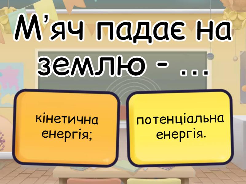 1) М’яч падає на землю - … a) кінетична енергія; b) потенціальна енергія. 2) Книжка лежить на столі - … a) кінетична енергія; b) потенціальна енергія. 3) Автобус їде по дорозі - … a) кінетична енергія; b) потенціальна енергія. 4) Стиснена пружина - … a) кінетична енергія; b) потенціальна енергія. 5) Птах летить у небі - … a) кінетична енергія; b) потенціальна енергія.