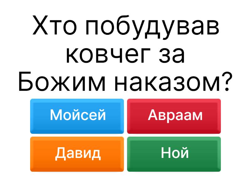 1) Хто побудував ковчег за Божим наказом? a) Мойсей b) Авраам c) Давид d) Ной 2) Як звали мати Ісуса? a) Анна b) Єва c) Марія d) Поліна 3) Які дари принесли мудреці Ісусові? a) хліб, вода, олія b) срібло, мед, вино c) золото, ладан смирна d) золото, пшениця, молоко 4) Як звали найсильнішого чоловіка? a) Голіаф b) Самсон c) Гедеон d) Давид 5) Кто та девушка, которая исполнила клятву отца и из-за этого не смогла выйти замуж?   a) Ревекка - дочь Вафуила b) Дочь Иефая c) Лия - дочь Лавана d) Рахиль - дочь Лавана 6) Як раніше звали апостола Павла? a) Симон b) Варфоломій c) Савл d) Кифа 7) В якому місті народився Ісус Христос? a) Єрусалим b) Назарет c) Нью-Йорк d) Віфлеєм 8) Хто був у череві кита 3 дні і 3 ночі? a) Мойсей b) Петро c) Йона d) Павло 9) Як називається молитва, яку навчив Ісус? a) Отче наш b) ПІсня Давида c) Молитва Йони d) не навчав 10) Скільки Ісус нагодував чоловіків 5 злібами і 2 рибками? a) 500 b) 3 000 c) 5 000 d) 300 11) Чому Ісус прийшов на Землю? a) щоб стати царем b) спасти від гріха c) щоб дати нам гроші d) просто так 12) На чому Ісус в'їхав в Єрусалим? a) віслюк b) автомобіль c) кінь d) верблюд