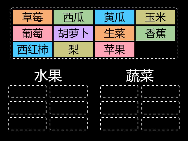 水果: 苹果, 梨, 香蕉, 草莓, 西瓜, 葡萄, 蔬菜: 胡萝卜, 玉米, 黄瓜, 生菜, 西红柿,