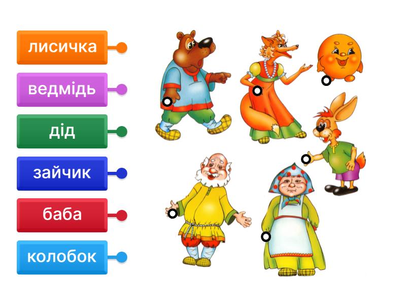 колобок, баба, лисичка, дід, ведмідь, зайчик.