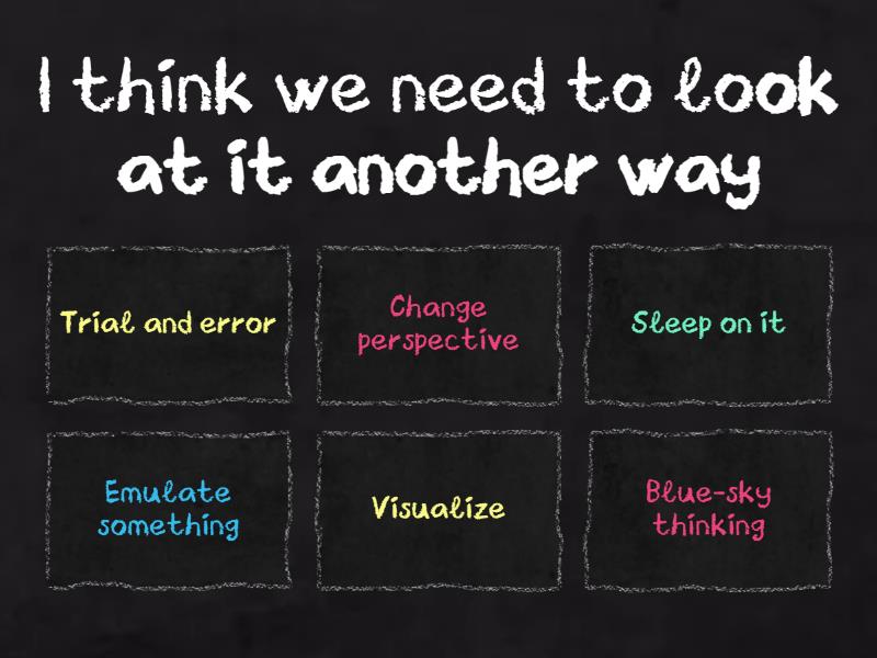 1) I think we need to look at it another way  a) Trial and error b) Change perspective c) Sleep on it d) Emulate something e) Visualize f) Blue-sky thinking 2) Questioning established beliefs can lead to new insights and discoveries. a) Trial and error b) Change perspective c) Sleep on it d) Emulate something e) Visualize f) Challenge assumptions 3) Let's find some really creative solutions  a) Trial and error b) Change perspective c) Sleep on it d) Emulate something e) Visualize f) Blue-sky thinking 4) Trying different approaches and learning from mistakes is often the key to finding the best solution. a) Trial and error b) Change perspective c) Sleep on it d) Emulate something e) Visualize f) Blue-sky thinking 5) Picture the outcome in your mind before taking action. a) Trial and error b) Change perspective c) Sleep on it d) Emulate something e) Visualize f) Blue-sky thinking 6) To find the solution we need to come back to this problem  a) Trial and error b) Change perspective c) Sleep on it d) Emulate something e) Visualize f) Blue-sky thinking 7) Try to replicate the approach to achieve similar results. a) Trial and error b) Change perspective c) Sleep on it d) Emulate something e) Visualize f) Blue-sky thinking