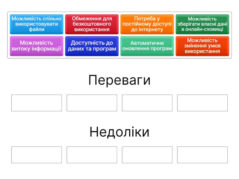 Переваги: Можливість зберігати власні дані в онлайн-сховищі, Доступність до даних та програм, Автоматичне оновлення програм, Можливість спільно використовувати файли, Недоліки: Потреба у постійному доступі до Інтернету, Можливість витоку інформації, Можливість змінення умов використання, Обмеження для безкоштовного використання,