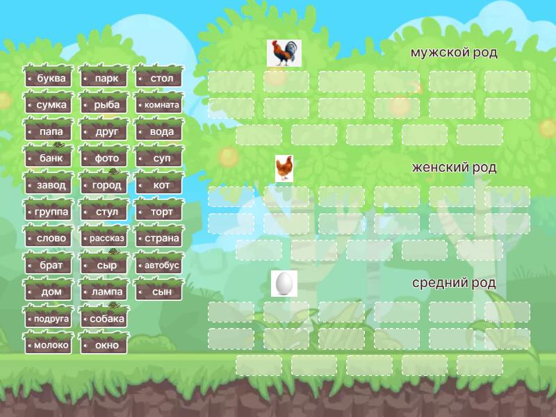 мужской род: брат, стол, стул, друг, дом, завод, парк, суп, папа, город, сын, кот, банк, автобус, рассказ, сыр, торт, женский род: подруга, группа, рыба, комната, лампа, буква, страна, собака, сумка, вода, средний род: фото, окно, молоко, слово,