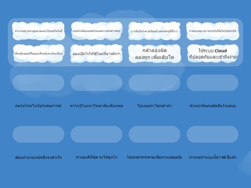 ทำงานอย่างชาญฉลาดและใช้เทคโนโลยี - ต้องทำงานหนักถึงจะสำเร็จ, ลองเปิดใจให้วิธีใหม่ที่อาจดีกว่า - เราเคยทำแบบนี้มา 10 ปีแล้ว, เรียนรู้ตลอดชีวิตและเรียนรู้นอกห้องเรียน - ความรู้ในมหาวิทยาลัยเพียงพอ, คนรุ่นใหม่มีมุมมองสดใหม่และความคิดสร้างสรรค์ - คนรุ่นใหม่ไม่มีประสบการณ์, ใช้ระบบ Cloud ที่ปลอดภัยและเข้าถึงง่าย - ใช้เอกสารกระดาษเพื่อความปลอดภัย, การตัดสินใจร่วมกันสร้างผลลัพธ์ที่ดีกว่า - หัวหน้าคือคนตัดสินใจเสมอ, การมอบหมายงานช่วยให้ทีมโตไปด้วยกัน - ทำเองดีที่สุด จะได้ถูกใจ, กล้าลองผิด ลองถูก เพื่อเติบโต - ไม่เคยทำ ไม่กล้าทำ,