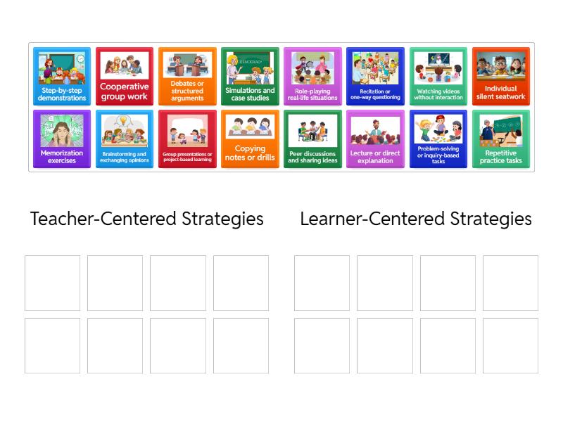 Teacher-Centered Strategies: Lecture or direct explanation, Step-by-step demonstrations, Copying notes or drills, Memorization exercises, Recitation or one-way questioning, Repetitive practice tasks, Individual silent seatwork, Watching videos without interaction, Learner-Centered Strategies: Cooperative group work, Peer discussions and sharing ideas, Problem-solving or inquiry-based tasks, Role-playing real-life situations, Brainstorming and exchanging opinions, Group presentations or project-based learning, Simulations and case studies, Debates or structured arguments,