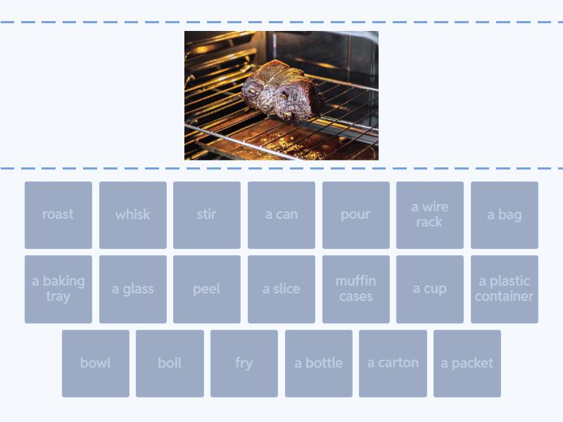 roast, stir, pour, peel, fry, boil, bowl, whisk, a baking tray, a wire rack, muffin cases, a plastic container, a can , a bottle, a carton, a cup, a glass, a packet, a slice, a bag,