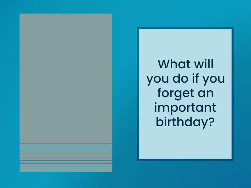 What will you do if someone talks loudly in the cinema while you're watching a film?, What will you do if you drop your phone in the toilet?, If you go out for dinner this evening, what will you eat?, What will you do if the power goes out in your home tonight?, What will you do if you forget an important birthday?, If your friend asks you to go out this evening, what will you say?, What will you do if you crack the screen on your phone?, If it rains this weekend, what will you do?, Where will you go if you have an unexpected day off?, If you meet a celebrity, what will you do?, If you need some advice, who will you ask?, If you are on holiday and the weather is bad, what will you do?.