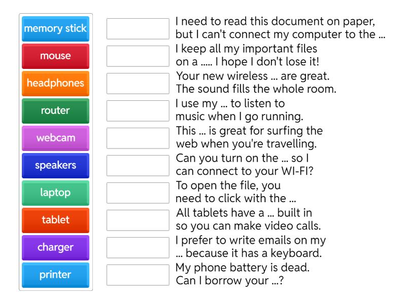 charger - My phone battery is dead. Can I borrow your ...?, router - Can you turn on the ... so I can connect to your WI-FI?, webcam - All tablets have a ... built in so you can make video calls., speakers - Your new wireless ... are great. The sound fills the whole room., laptop - I prefer to write emails on my ... because it has a keyboard., memory stick - I keep all my important files on a ..... I hope I don't lose it!, headphones - I use my ... to listen to music when I go running., tablet - This ... is great for surfing the web when you're travelling., mouse - To open the file, you need to click with the ..., printer - I need to read this document on paper, but I can't connect my computer to the ...,
