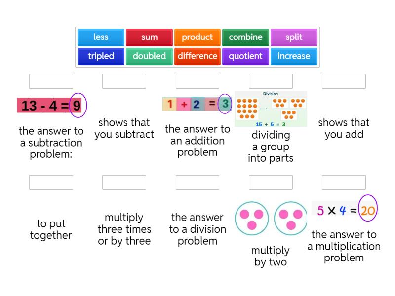 combine - to put together, difference - the answer to a subtraction problem: , doubled - multiply by two, sum - the answer to an addition problem, less - shows that you subtract, increase - shows that you add, quotient - the answer to a division problem, split - dividing a group into parts, product - the answer to a multiplication problem, tripled - multiply three times or by three,