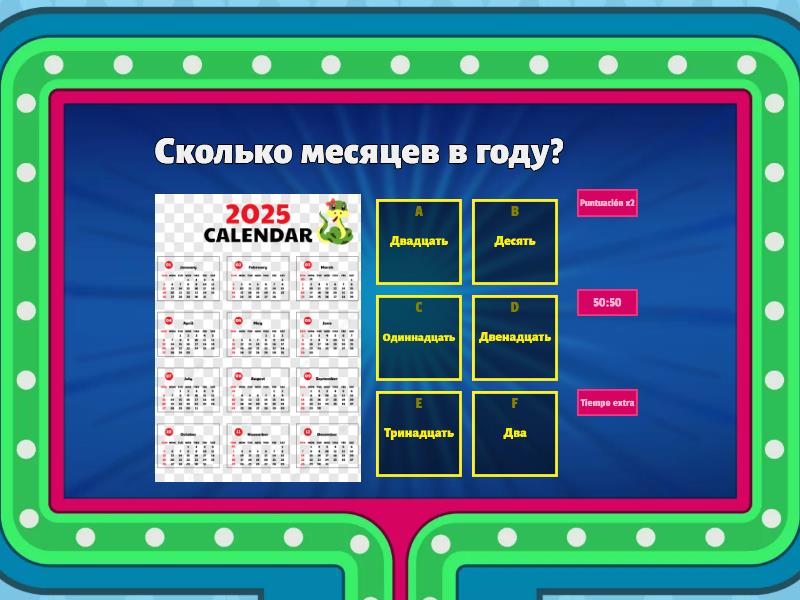 1) Сколько месяцев в году? a) Двадцать b) Десять c) Одиннадцать d) Двенадцать e) Тринадцать f) Два 2) Сколько дней в неделе? a) Семь b) Пять c) Три d) Десять e) Двенадцать f) Четырнадцать 3) Сколько пальцев на одной руке? a) Пять b) Три c) Два d) Шесть e) Семь f) Четыре 4) Сколько у нас пальцев на руках и ногах? a) Пять b) Восемь c) Десять d) Двадцать e) Пятнадцать f) Тридцать 5) Сколько ног у паука? a) Восемь b) Шесть c) Десять d) Четыре e) Две f) Девять 6) Сколько ног у жука? a) Восемь b) Шесть c) Десять d) Четыре e) Две f) Девять 7) Сколько часов в сутках? a) Двадцать четыре b) Двенадцать c) Шестнадцать d) Тридцать e) Сорок восемь f) Сорок 8) Сколько минут в часе? a) Шестьдесят b) Тридцать c) Пятнадцать d) Двадцать e) Десять f) Сорок 9) Сколько дней в феврале в високосный год? (leap year) a) Двадцать девять b) Тридцать c) Двадцать восемь d) Тридцать один e) Двадцать семь f) Двадцать шесть 10) Сколько дней в феврале в невисокосный год? (common year) a) Двадцать девять b) Тридцать c) Двадцать восемь d) Тридцать один e) Двадцать семь f) Двадцать шесть 11) Сколько сторон у треугольника? a) Три b) Четыре c) Пять d) Шесть e) Две f) Одна 12) Сколько углов у квадрата? a) Четыре b) Три c) Пять d) Шесть e) Семь f) Девять 13) Сколько лап у кошки? a) Четыре b) Две c) Три d) Шесть e) Восемь f) Десять 14) Сколько зубов у взрослого человека? a) Тридцать два b) Двадцать c) Десять d) Тридцать e) Сорок f) Пятьдесят 15) Сколько букв в русском алфавите? a) Тридцать три b) Тридцать c) Двадцать d) Двадцать шесть e) Сорок f) Пятьдесят 16) Сколько дней в невисокосном году? a) Триста шестьдесят пять b) Триста сорок пять c) Триста шестьдесят три d) Триста шестьдесят шесть e) Триста пятьдесят пять f) Триста пятьдесят шесть 17) Сколько дней в високосном году? a) Триста шестьдесят пять b) Триста сорок пять c) Триста шестьдесят три d) Триста шестьдесят шесть e) Триста пятьдесят пять f) Триста пятьдесят шесть 18) Сколько ног у муравья? a) Шесть b) Восемь c) Десять d) Четыре e) Две f) Девять 19) Сколько цветов в радуге? a) Семь b) Пять c) Три d) Десять e) Двенадцать f) Четырнадцать