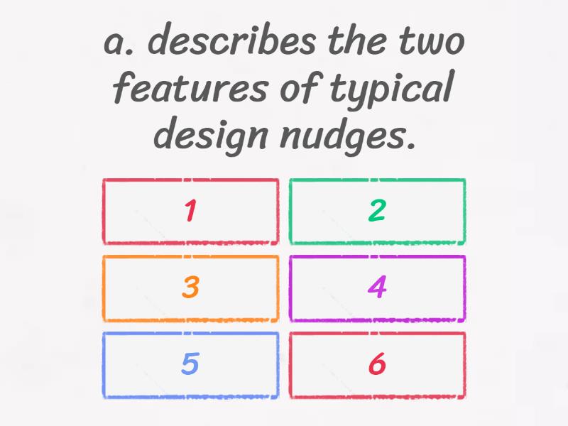1) a. describes the two features of typical design nudges. a) 1 b) 2 c) 3 d) 4 e) 5 f) 6 2) b. discusses some examples of design nudges in schools. a) 1 b) 2 c) 3 d) 4 e) 5 f) 6 3) c. explains how a design nudge improved safety in a city. a) 1 b) 2 c) 3 d) 4 e) 5 f) 6 4) d. introduces the idea that nudges can be bad for people. a) 1 b) 2 c) 3 d) 4 e) 5 f) 6 5) e. mentions nudges that may affect the foods people choose. a) 1 b) 2 c) 3 d) 4 e) 5 f) 6 6) f. refers to a nudge that might change how shoppers act. a) 1 b) 2 c) 3 d) 4 e) 5 f) 6