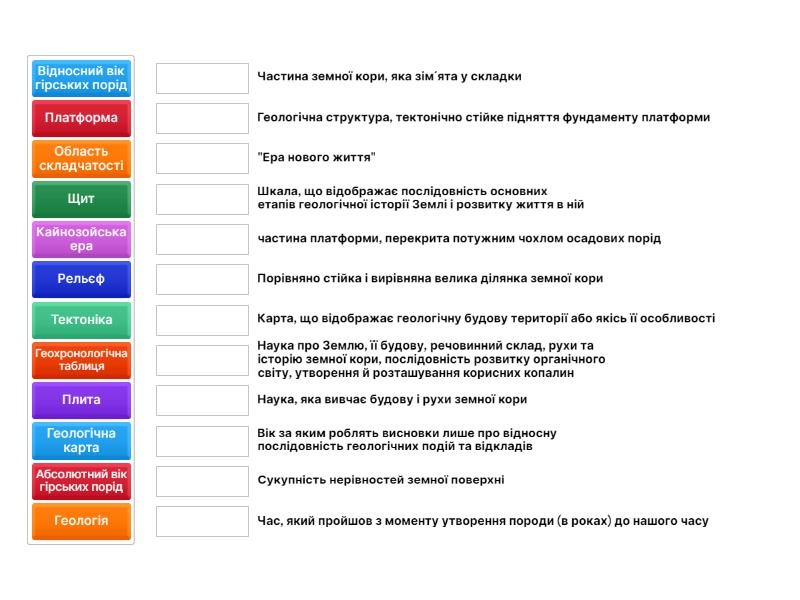 Рельєф - Сукупність нерівностей земної поверхні, Платформа - Порівняно стійка і вирівняна велика ділянка земної кори, Щит - Геологічна структура, тектонічно стійке підняття фундаменту платформи, Плита - частина платформи, перекрита потужним чохлом осадових порід, Область складчатості - Частина земної кори, яка зім´ята у складки, Геохронологічна таблиця - Шкала, що відображає послідовність основних етапів геологічної історії Землі і розвитку життя в ній, Кайнозойська ера - "Ера нового життя", Відносний вік гірських порід - Вік за яким роблять висновки лише про відносну послідовність геологічних подій та відкладів, Геологія - Наука про Землю, її будову, речовинний склад, рухи та історію земної кори, послідовність розвитку органічного світу, утворення й розташування корисних копалин, Абсолютний вік гірських порід - Час, який пройшов з моменту утворення породи (в роках) до нашого часу, Геологічна карта - Карта, що відображає геологічну будову території або якісь її особливості, Тектоніка - Наука, яка вивчає будову і рухи земної кори,