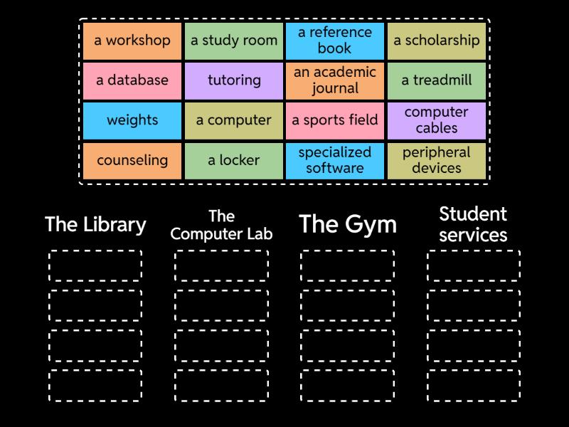 The Library: a database, a reference book, a study room, an academic journal, The Computer Lab: a computer, peripheral devices, computer cables, specialized software, The Gym: a sports field, a treadmill, a locker, weights, Student services: a scholarship, tutoring, counseling, a workshop,