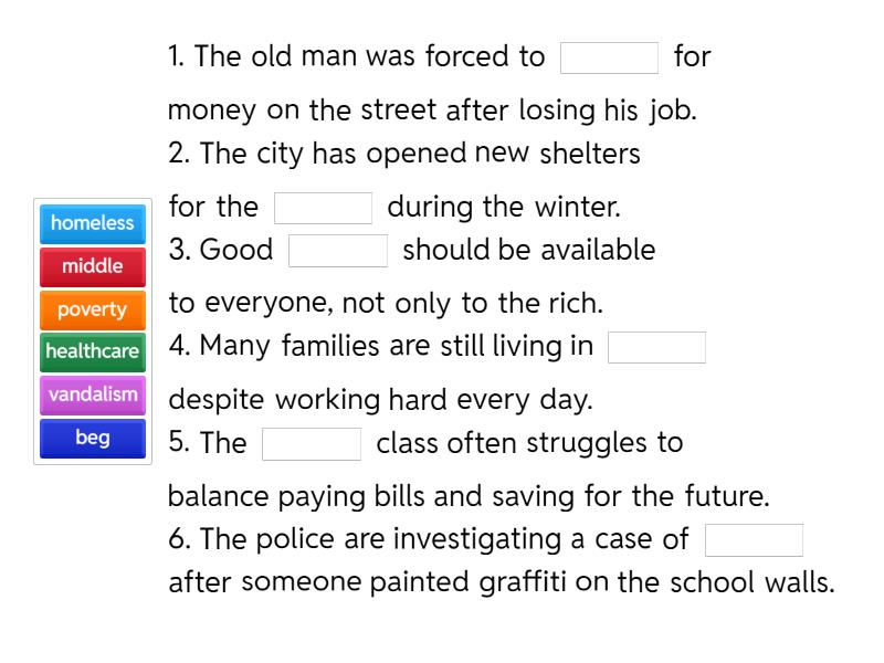 1. The old man was forced to ____ for money on the street after losing his job. 2. The city has opened new shelters for the ____ during the winter. 3. Good ____ should be available to everyone, not only to the rich. 4. Many families are still living in ____ despite working hard every day. 5. The ____ class often struggles to balance paying bills and saving for the future. 6. The police are investigating a case of ____ after someone painted graffiti on the school walls. 7. People from all ____ of life joined the festival to celebrate together. 8. Paying taxes is a ____ of life that everyone has to accept. 9. When you travel abroad for the first time, you can have the ____ of your life. 10. Clean air and safe streets improve the ____ of life in a city. 11. Volunteering abroad is a chance to ____ life from a completely new perspective. 12. Thanks to modern medicine, the average life ____ has increased around the world.