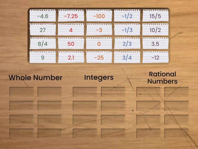 Whole Number: 0, 4, 9, 27, 10/2, 15/5, 8/4, 50, Integers: -3, -12, -25, -100, Rational Numbers: 2/3, 3/4, -1/2, 3.5, -7.25, 2.1, -4.6, -1/3,