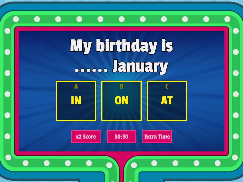 1) My birthday is ...... January a) IN b) ON c) AT 2) Holidays begin ...... Saturday, July 18th a) IN b) ON c) AT 3) We go to the beach ...... Summer a) IN b) ON c) AT 4) What time does the Racing-Boca match start? ......7 o'clock a) IN b) ON c) AT 5) The party is ...... the 12th March a) IN b) ON c) AT 6) I was born ....... 1956.  a) IN b) ON c) AT 7) I usually stay in ........ the weekend. a) IN b) ON c) AT 8) She doesn't get up early .......the morning. a) IN b) ON c) AT 9) I go home ....... lunchtime time. a) IN b) ON c) AT