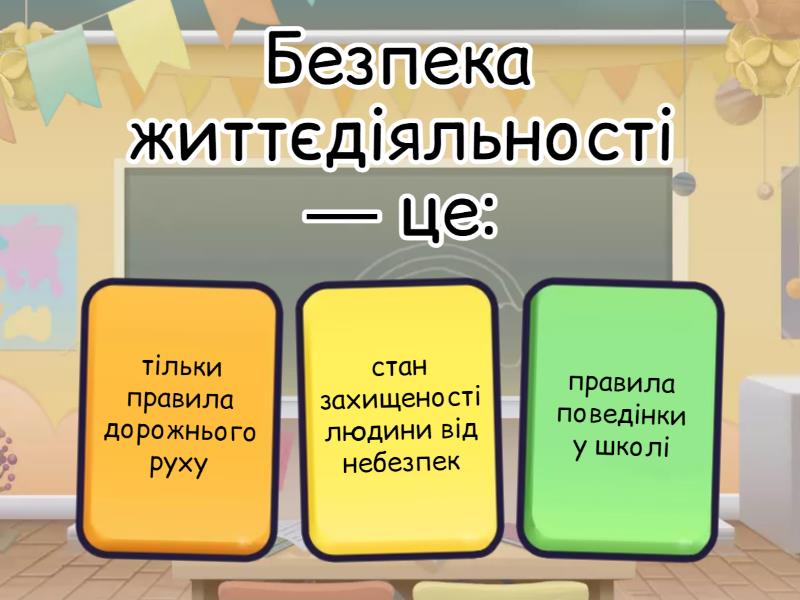 1) Безпека життєдіяльності — це: a) тільки правила дорожнього руху b) стан захищеності людини від небезпек c) правила поведінки у школі 2) До якого виду ризику належить булінг? a) Соціальні / психологічні b) Фізичні c) Екологічні 3) Що робити при запаху газу вдома? a) Запалити сірник b) Відкрити вікна і викликати допомогу c) Лягти спати 4) При повітряній тривозі потрібно: a) бігти на вулицю b) сховатися в укриття c) залишитися біля вікна 5) Що відноситься до екологічних ризиків? a) Падіння з велосипеда b) Забруднене повітря c) Конфлікт з другом 6) Твоєму однокласнику стало зле. Твої дії: a) Викликати допомогу b) Сміятися c) Ігнорувати 7) Яке правило поведінки у воєнний час правильне? a) Торкатися підозрілих предметів b) Залишатися біля вікна під час обстрілу c) Йти в укриття при сигналі тривоги 8) До фізичних ризиків належить: a) Травма під час гри b) Забруднення води c) Конфлікт у класі 9) Що слід робити при пожежі у школі? a) Швидко вибігти згідно з планом евакуації b) Сховатися у класі c) Дзвонити друзям 10) Вибери правильне твердження: a) Безпека життєдіяльності — це тільки обов’язок держави b) За безпеку відповідає і людина, і суспільство c) Учням не потрібно знати правила безпеки 11) Яке з наведених правил допоможе зберегти безпеку вдома? a) Гратися сірниками b) Вмикати електроприлади мокрими руками c) Виключати світло та прилади після використання