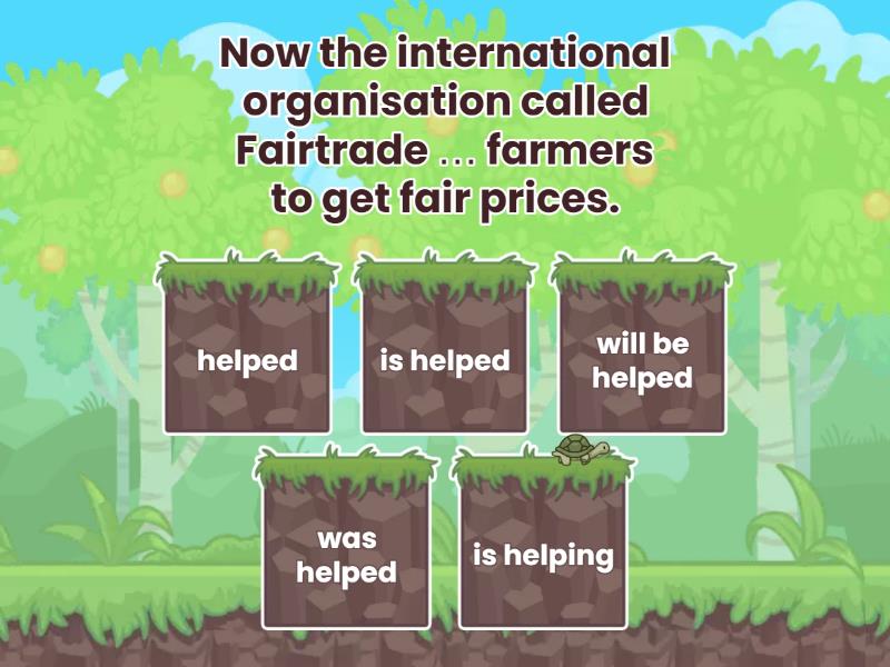 1) Now the international organisation called Fairtrade … farmers to get fair prices. a) helped b) is helped c) will be helped d) was helped e) is helping 2) Nowadays a new trend … in opposition to consumerism – the "buy nothing" trend. a) will appear b) will be appeared c) is appearing d) is appeared e) was appeared 3) By the time we arrived, the play … already. a) has started b) had started c) started d) was started e) was starting 4) She usually … to school by bus, but today she … a taxi. a) goes / is taking b) go / takes c) is going / takes d) has gone / took e) goes/ takes 5) When I was younger, I … football every weekend. a) play b) have played c) played d) was playing e) was played 6) Look! The children … in the garden. a) played b) are playing c) play d) have played e) is play 7) Just then, a group of dolphins ... . a) had arrived  b) has arrived c) was arrived  d) arrived  e) will be arrived 8) Thus, he ... by dolphins. a) rescued b) was rescued c) has rescue d) was rescuing e) had rescued 9) Recently, journalists ... to the Garo Hills in northern India to look into reports that the Mande Barung has been seen. a) are travelled b) have travelled c) will travel d) were travelled e) travel 10) Tengsim was walking through the forest when he ...across the animal sitting on a rock playing with a stone. a) has come b) will come c) was come d) came e) is come