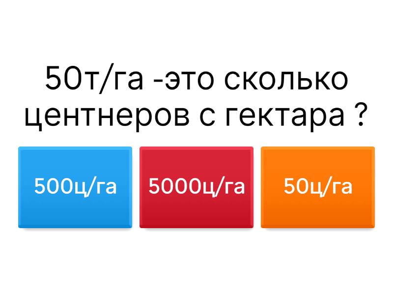 1) 50т/га -это сколько центнеров с гектара ? a) 500ц/га b) 5000ц/га c) 50ц/га 2) Сколько соток в одном гектаре ? a) 10 b) 50 c) 100 d) 5 3) Урожайность 5 кг/м². Сколько килограммов соберут с одной сотки (100 м²)? a) 50кг b) 500кг c) 5000кг d) 5кг 4) Почему 1 ар называют «соткой»? a) потому что это 10м2 b) потому что это 100м2 c) потому что это 1000м2 d) потому что это 1м2 5) 500 ц/га — это сколько килограммов с 1 м²? a) 0,5кг/м2 b) 5кг/м2 c) 50кг/м2 d) 500кг/м2