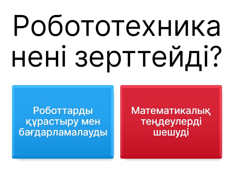 1) Робототехника нені зерттейді? a) Роботтарды құрастыру мен бағдарламалауды b) Математикалық теңдеулерді шешуді 2) Роботтың қозғалысын қамтамасыз ететін бөлік қайсы? a) Мотор b) Монитор 3) Контроллердің міндеті қандай? a) Мәліметті өңдеу және басқару b) Роботтың сыртын бояу 4) Қоршаған ортадан ақпарат алатын құрылғы қалай аталады? a) Датчик b) Динамик 5) Тұрмыстық роботтарға мысал келтіріңіз: a) Шаңсорғыш робот b) Калькулятор