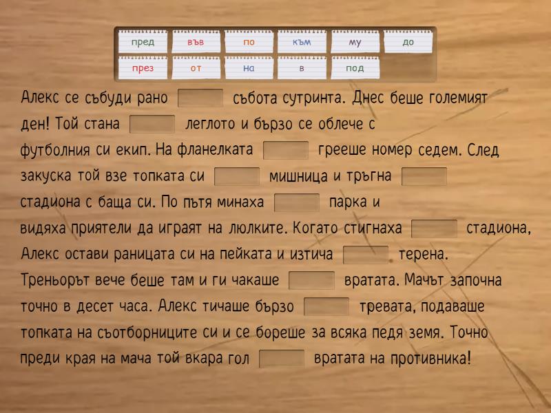 Алекс се събуди рано ____ събота сутринта. Днес беше големият ден! Той стана ____ леглото и бързо се облече с футболния си екип. На фланелката ____ грееше номер седем. След закуска той взе топката си ____ мишница и тръгна ____ стадиона с баща си. По пътя минаха ____ парка и видяха приятели да играят на люлките. Когато стигнаха ____ стадиона, Алекс остави раницата си на пейката и изтича ____ терена. Треньорът вече беше там и ги чакаше ____ вратата. Мачът започна точно в десет часа. Алекс тичаше бързо ____ тревата, подаваше топката на съотборниците си и се бореше за всяка педя земя. Точно преди края на мача той вкара гол ____ вратата на противника!