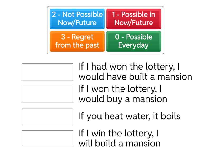 0 - Possible Everyday - If you heat water, it boils, 1 - Possible in Now/Future - If I win the lottery, I will build a mansion, 2 - Not Possible Now/Future - If I won the lottery, I would buy a mansion, 3 - Regret from the past - If I had won the lottery, I would have built a mansion,
