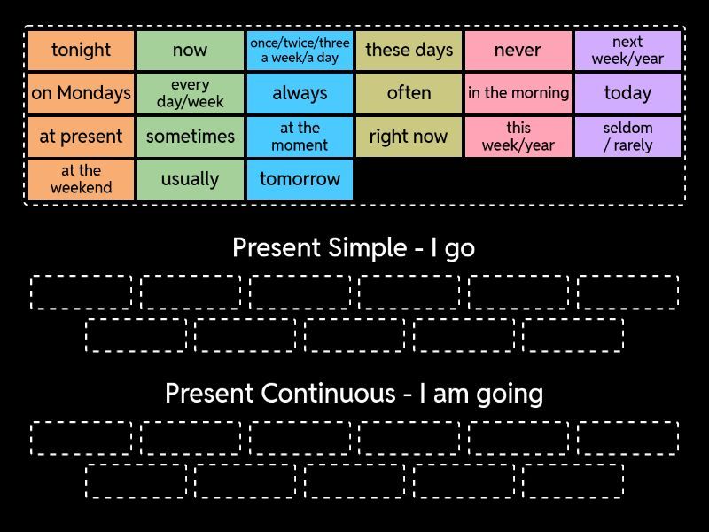 Present Simple - I go : always, usually, often, seldom / rarely, sometimes, never, every day/week, in the morning, on Mondays, at the weekend, once/twice/three a week/a day, Present Continuous - I am going: now, right now, at the moment, at present, today, these days, this week/year, tonight, tomorrow, next week/year,