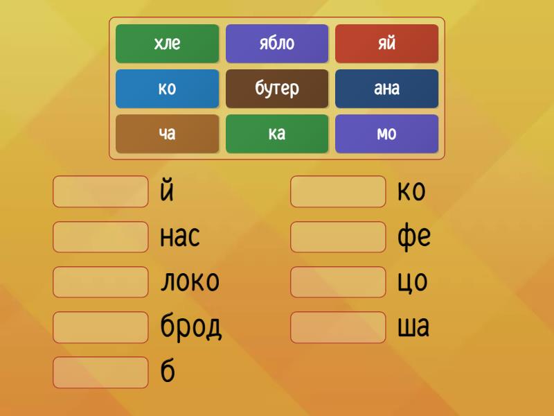 мо - локо , ко - фе, ча - й, ябло - ко, ана - нас, бутер - брод, яй - цо, ка - ша, хле - б,