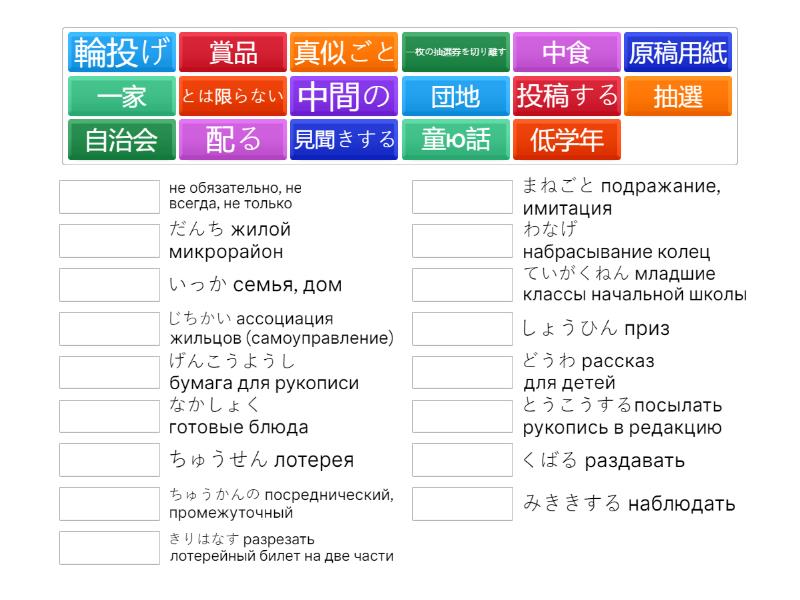 団地 - だんち жилой микрорайон, 輪投げ - わなげ набрасывание колец, 自治会 - じちかい ассоциация жильцов (самоуправление), 抽選 - ちゅうせん лотерея, 一家 - いっか семья, дом, 配る - くばる раздавать, 一枚の抽選券を切り離す - きりはなす разрезать лотерейный билет на две части, 賞品 - しょうひん приз, とは限らない - не обязательно, не всегда, не только, 見聞きする - みききする наблюдать, 中食 - なかしょく готовые блюда, 中間の - ちゅうかんの посреднический, промежуточный, 低学年 - ていがくねん младшие классы начальной школы, 真似ごと - まねごと подражание, имитация, 原稿用紙 - げんこうようし бумага для рукописи, 投稿する - とうこうするпосылать рукопись в редакцию, 童ю話 - どうわ рассказ для детей,