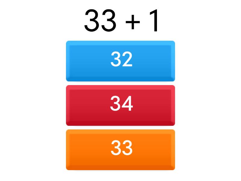1) 33 + 1 a) 32 b) 34 c) 33 2) 10+ 43 a) 63 b) 33 c) 53 3) 68+1 a) 69 b) 67 c) 68 4) 99-1 a) 99 b) 97 c) 98 5) 75 + 10 a) 65 b) 85 c) 95 6) 77-1 a) 76 b) 75 c) 78
