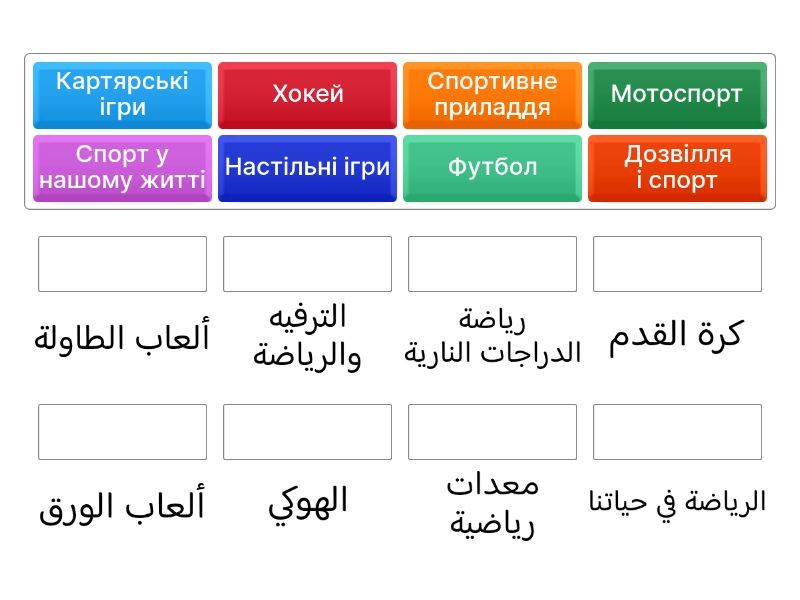 Дозвілля і спорт - الترفيه والرياضة, Спорт у нашому житті - الرياضة في حياتنا, Спортивне приладдя - معدات رياضية, Олімпійські ігри - الألعاب الأولمبية, Спортивні змагання - المنافسة الرياضية, Місця для занять спортом - أماكن للرياضة, Футбол - كرة القدم, Хокей - الهوكي, Баскетбол - كرة السلة, Картярські ігри - ألعاب الورق, Настільні ігри - ألعاب الطاولة, Шахи - الشطرنج, Автоспорт - رياضة السيارات, Мотоспорт - رياضة الدراجات النارية, Вітрильний спорт - رياضة الإبحار,