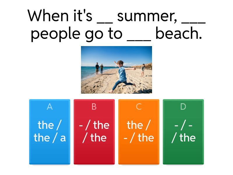 1) When it's __ summer, ___ people go to ___ beach. a) the / the / a b) - / the / the c) the / - / the d) - / - / the 2) __ children should be raised with __ love. a) the / - b) a / - c) - / the d) - / - 3) __ new trafic rule was set last week. __ new regulation forces us to buckle __ safety belts inside de car. a) a / - / the b) a / the / - c) the / a / - d) the / - / the 4) None of __ participants attended __ meeting but __ unregistered woman did. a) the / a / - b) the / - / an c) the / the / an d) the / an / -