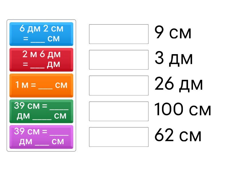 1 м = ___ см - 100 см, 2 м 6 дм = ___ дм - 26 дм, 6 дм 2 см = ___ см - 62 см, 39 см = ____ дм ____ см - 3 дм, 39 см = ____ дм ___ см - 9 см,
